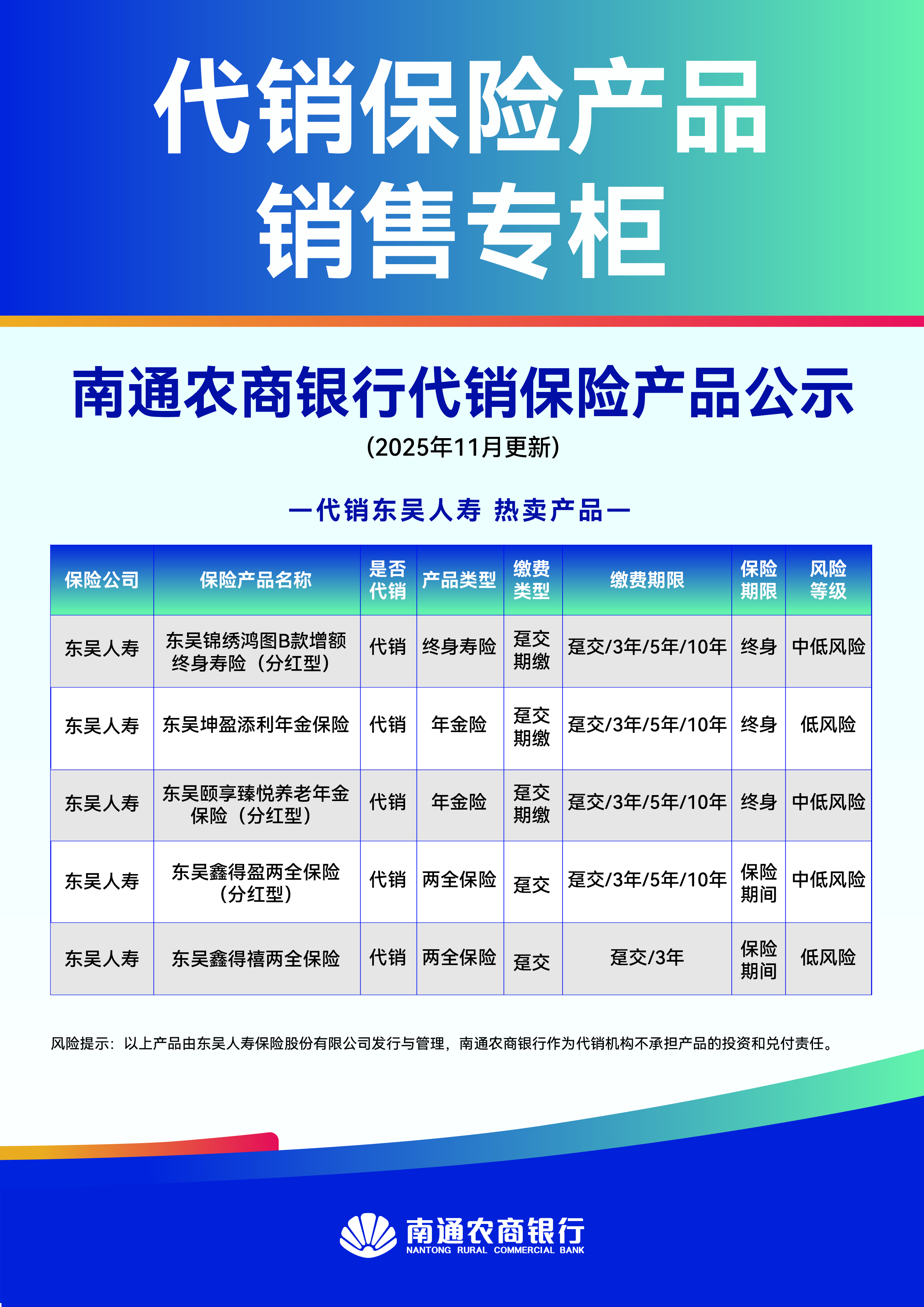 南通农商银行代销保险产品公示(2025年11月更新)——东吴人寿